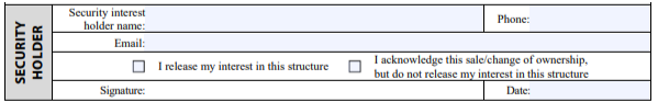 Security Holder Release. This last section on the last page is for current security interest holders to sign-off that they’ve been paid in full for the amount they lent to the seller(s) in the previous sale. If there is a lien against the house, of any kind, the transaction can’t record until this is filled out. In our example, there is no mortgage on the house so we leave this empty.