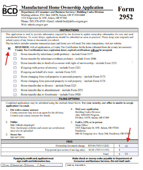 Form 2952 is the ownership transfer form. You can download the form for free, but the cost of turning in the form once complete is $55. Below are pictures and explanations on how to complete this form (this is not legal advice, if you are uncertain, please contact an attorney or the Oregon Building Codes Division and they will walk you through how to fill out each section).