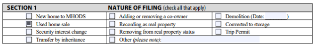 Section 1 – Nature of Filing. For our example, you’ll just select “Used home sale”