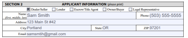 Section 2 – Applicant Information. This is the section for the applicant, the person filing the form. This can be anyone listed here. In this example, we’re going to say the applicant is the Seller.