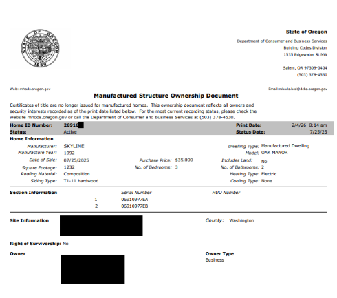 Once you have both Form 2952 completed and a valid County Tax Certification that shows no taxes are owed on the home, you need to submit both forms. If your Form 2952 has the wet signatures, you can simply turn these into the County Tax Assessor’s office, the same office you received the Valid County Tax Certification. They’ll submit them to the Oregon Building Codes Division for you and email you once they’ve been successfully recorded. If you don’t have the wet signatures on Form 2952, the County will give you the Tax Certification but you’ll need to submit those yourself to the Building Codes Division in Salem at 1535 Edgewater St NW, Salem, OR 97304, in person or via mail. Or, you could submit them online at MHODS (Manufactured Home Ownership Document System). You’ll need to create an account and upload the docs yourself.