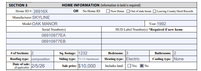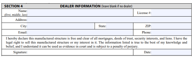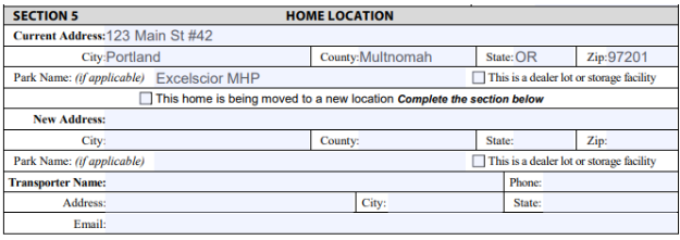 Section 5 – Home Location. This is the location where the home is currently located. If the home will be removed after the sale, you’ll need to add the new address and the transporter name at the bottom.