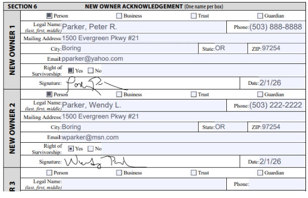 Section 6 – New Owner Acknowledgement. This is the section the new owner(s) complete. Right of Survivorship means that if one of the owner(s) pass away, ownership of the home automatically transfers to the other owner(s), without the need to go through probate. Right of Survivorship can be checked for anyone.