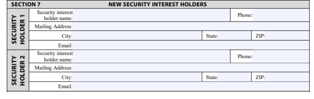Section 7 – Security Interest Holders. If the buyer were to purchase the home with a mortgage, the bank would be listed here as a security interest holder. Because we’re selling for cash, this section will be blank.