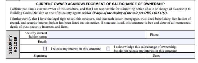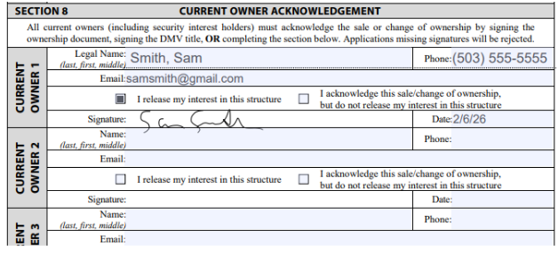 Section 8 – Current Owner Acknowledgement. This section is for the seller(s) to complete. Make sure the seller checks the box saying, “I release my interest in this structure”.